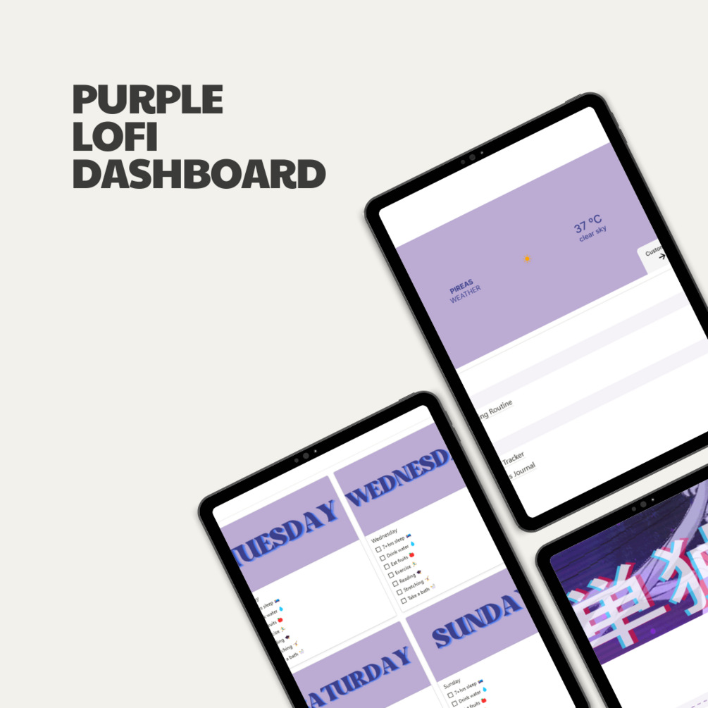 Introducing our Purple Lofi Aesthetics Notion Dashboard: Your all-in-one solution for an organized and inspired life. This beautifully designed dashboard is here to help you stay on track and motivated with every aspect of your day. Start your mornings with a refreshing routine and set the tone for a productive day. Keep your life in order with our habit tracker, fitness journal, and work section. Dive into captivating audiobooks, podcasts, and curated music playlists in your personal section. Stay connected and manage your social media effortlessly. The dashboard also features a clock, weather updates to make your home screen functional and stylish. Plus, throughout your journey, find inspiration with our collection of motivational quotes. Embrace a more organized and motivated you with our Purple Lofi Aesthetics Notion Dashboard, designed to enhance your life, one day at a time.